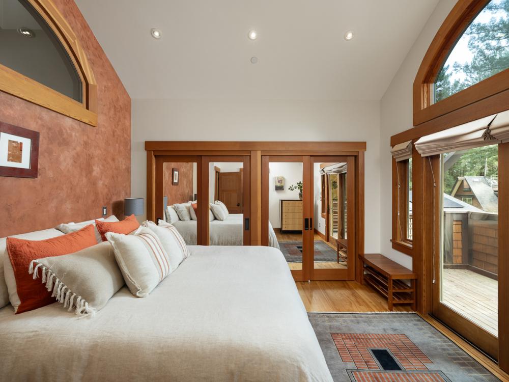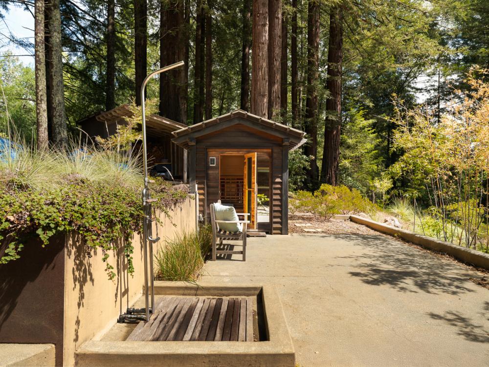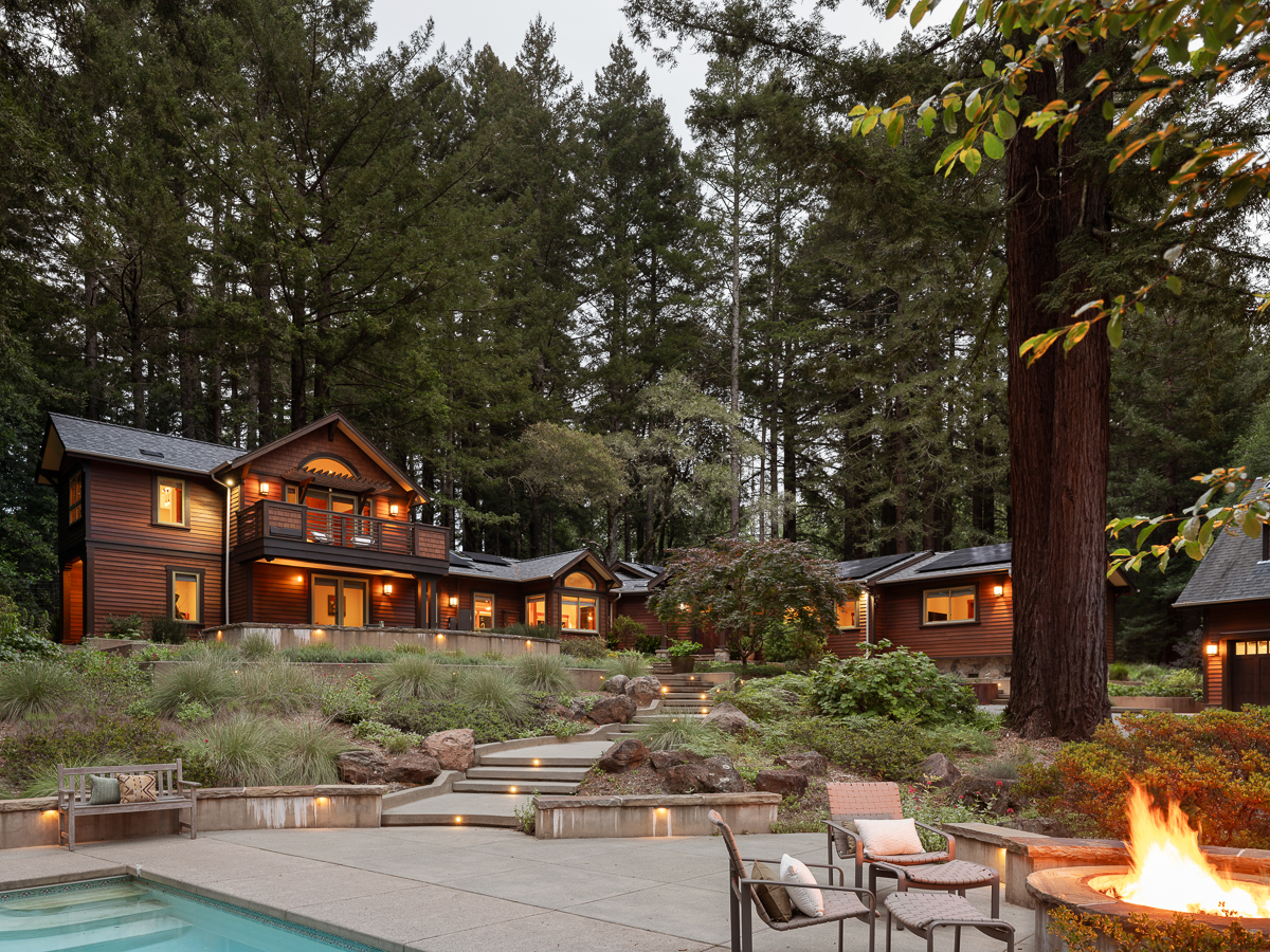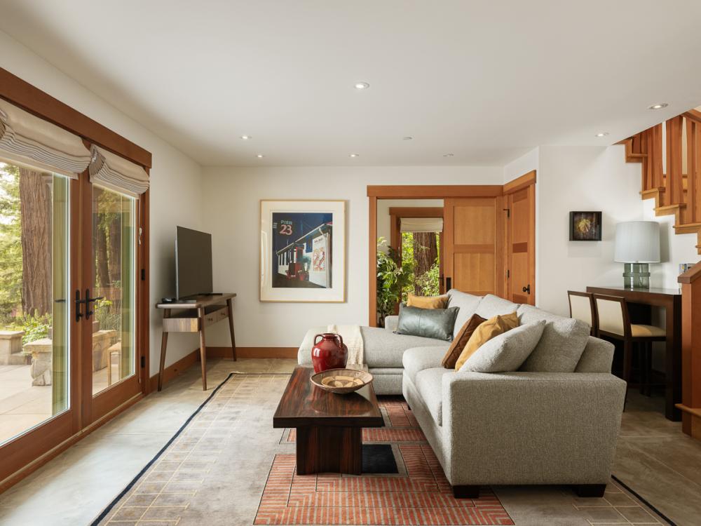 Designed by Richard K. Pate and built by Hopkin Construction, the home was thoughtfully positioned to take advantage of both the grove and the light above the fog line. Each room is oriented to capture dual exposures, bringing in views of redwoods, landscaping, and distant vineyards throughout the day. Natural materials carry through the interiors, with varied wood finishes, custom cabinetry, and concrete flooring with radiant heat grounding the space.