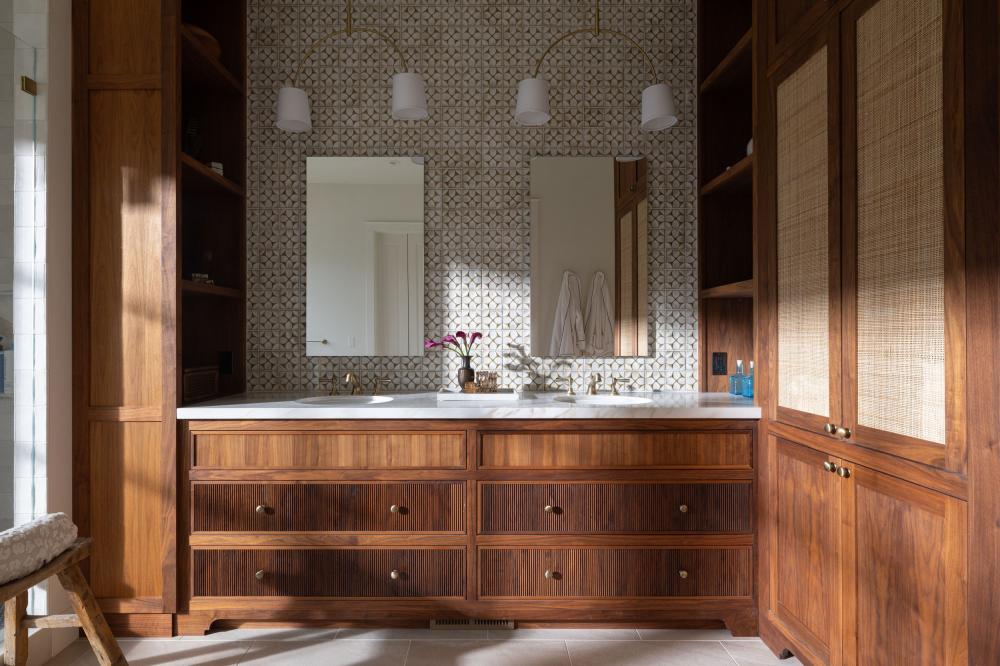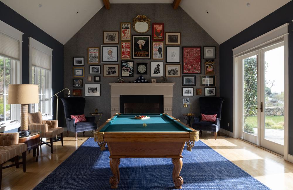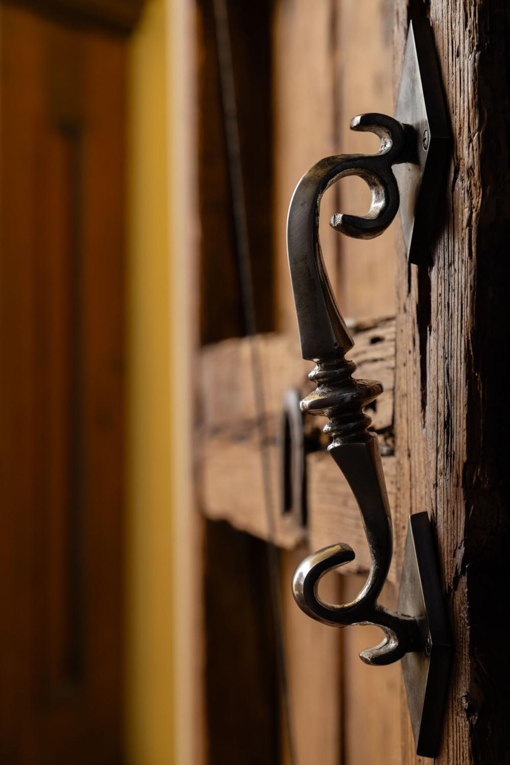 Inside, the home unfolds across 13 rooms, 3 bedrooms, and 4.5 baths. Vaulted ceilings, handcrafted woodwork, and expansive French doors define the interiors. A Shaker-style cherry banister anchors the central staircase, while carved South American doors and reclaimed beams add character throughout. Natural light floods the living areas from clerestory windows and skylights, highlighting the home’s refined yet comfortable design.