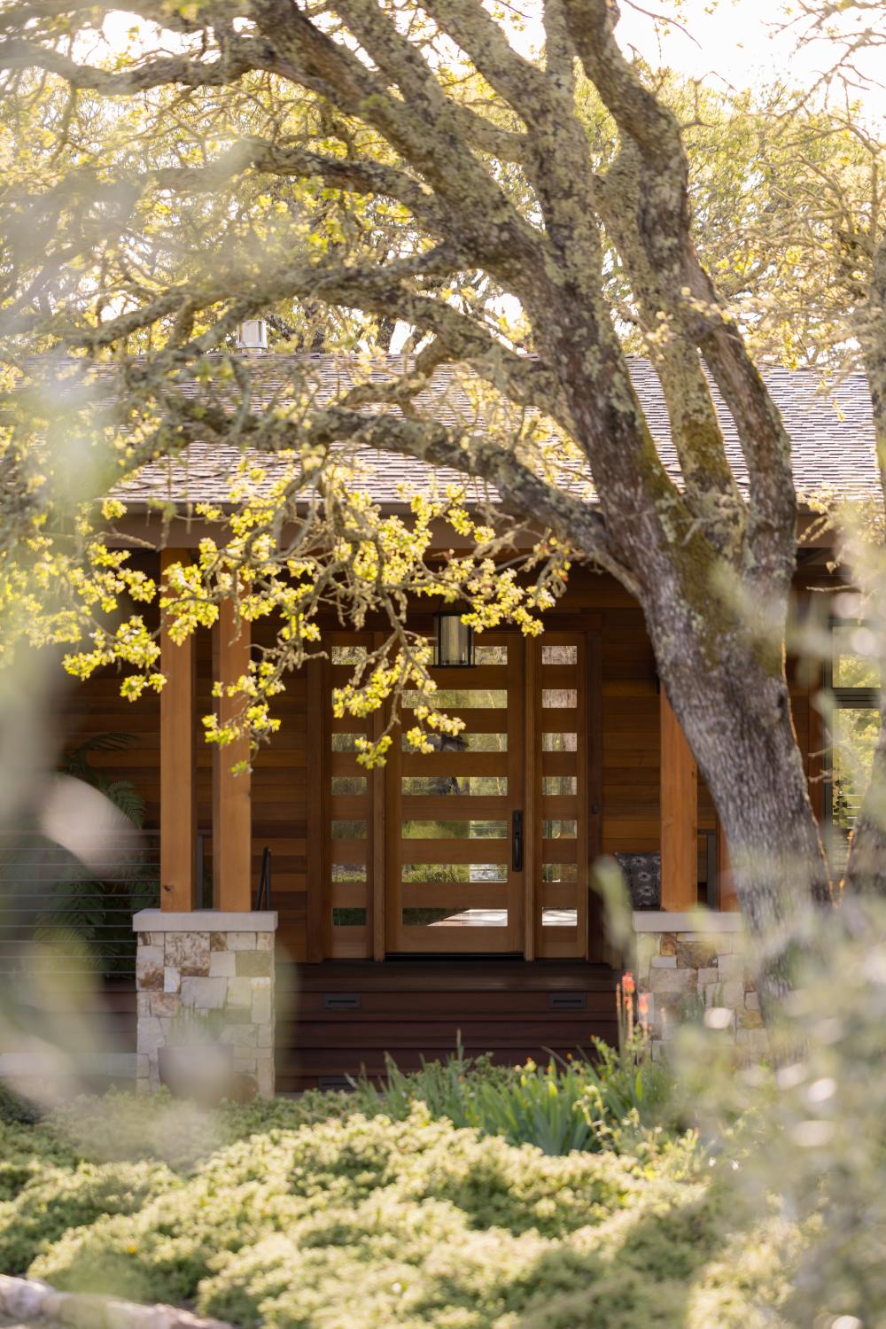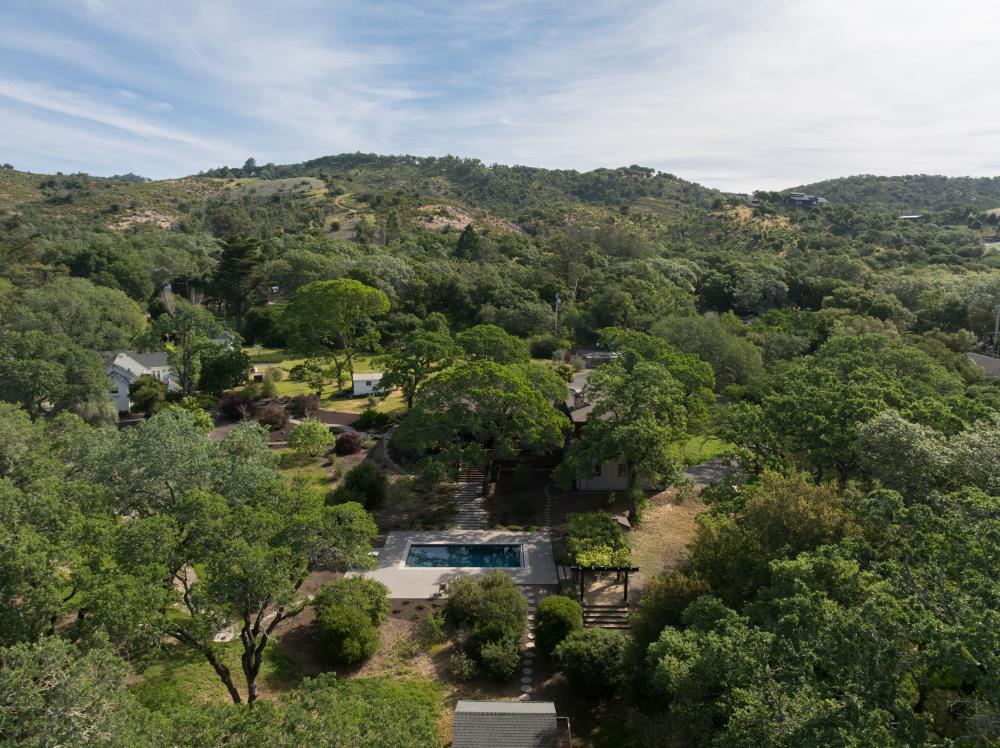 Mature landscaping including oak, madrone, redwood and buckeye trees