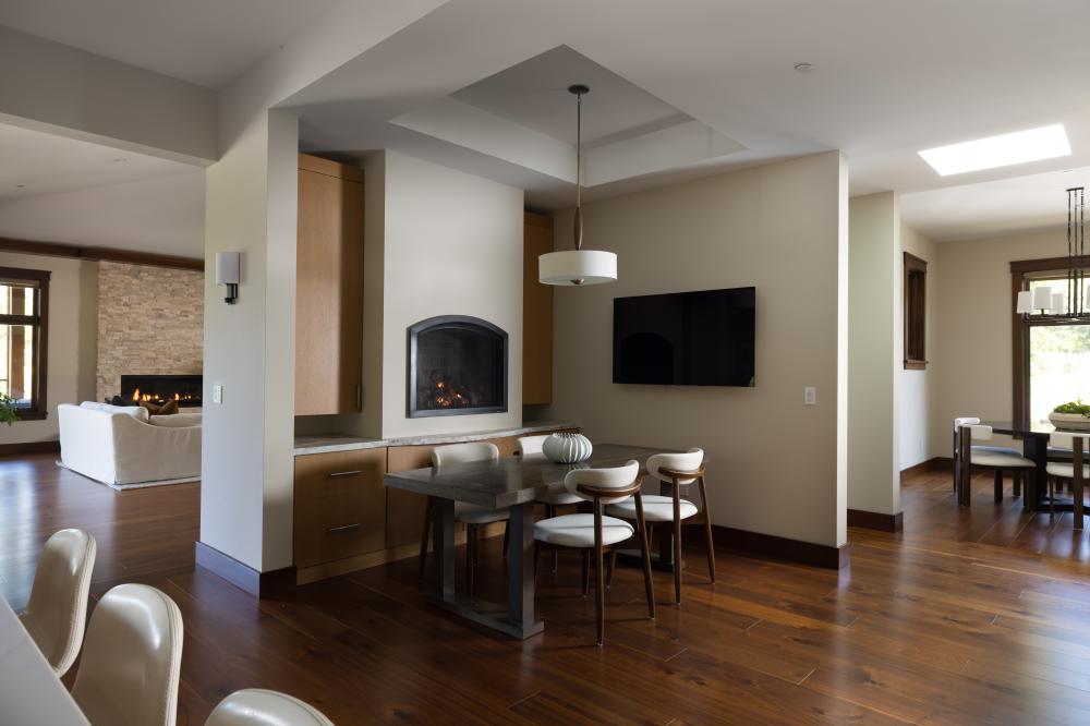 Seating area off kitchen with fireplace, sink and coffee/beverage bar