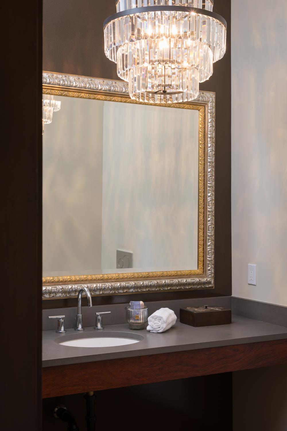 A few steps from the great room sits a powder room with a floating vanity and a beautiful glass chandelier. Next you’ll find a cozy den and seating area with a large window looking onto the yard. This is a perfect media room and provides privacy from the main entertaining and living areas.