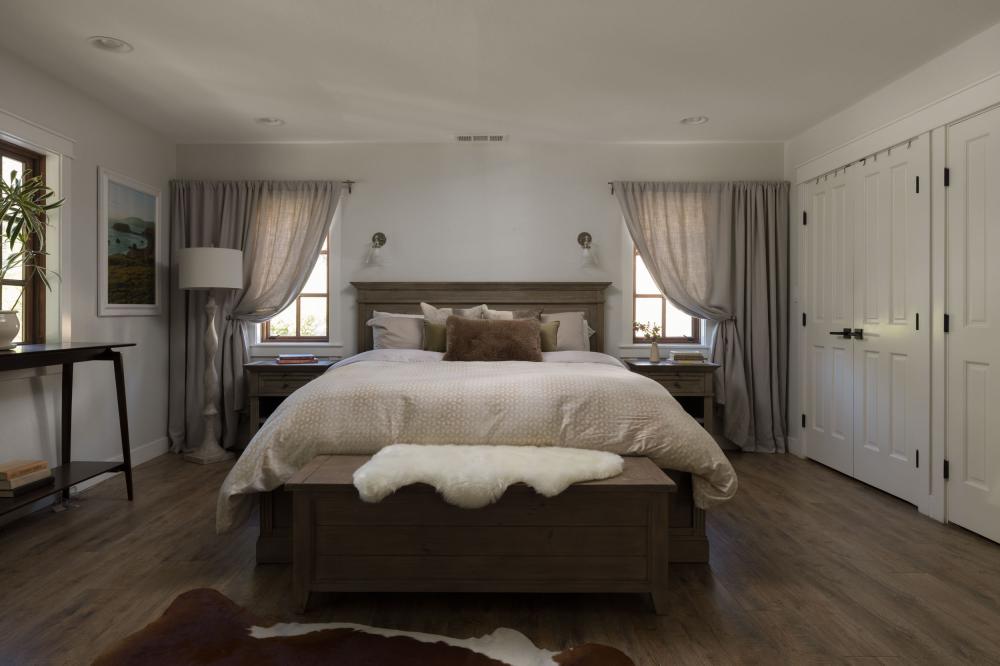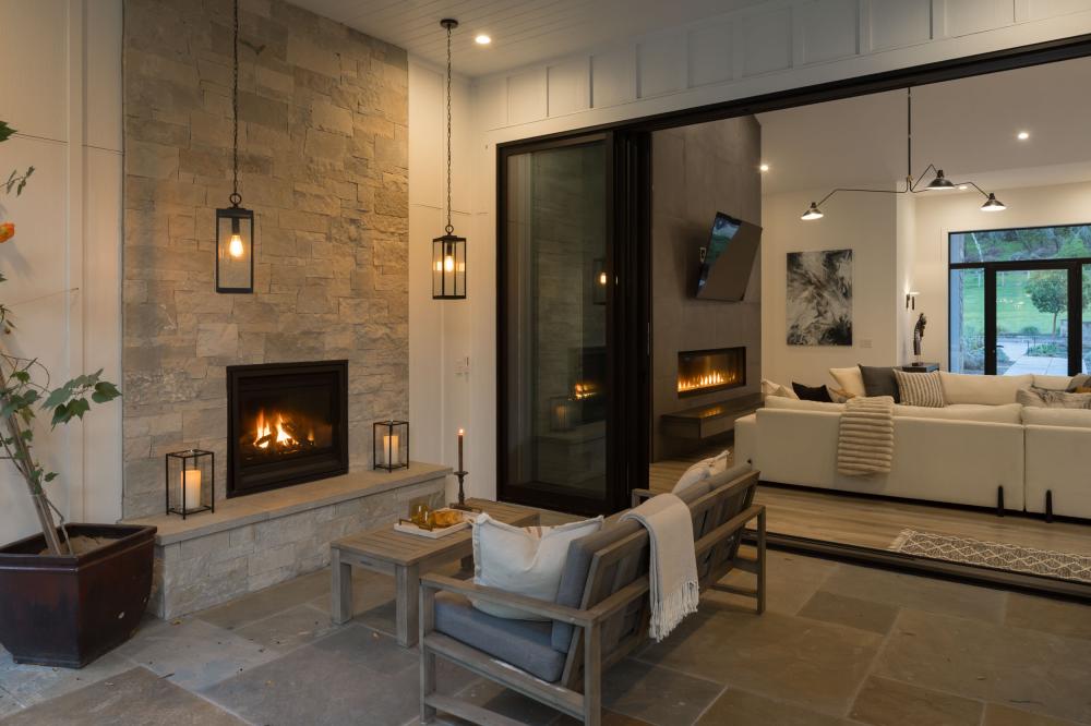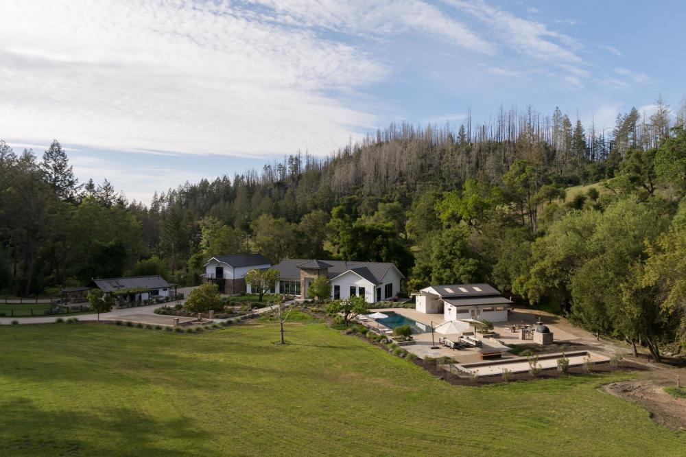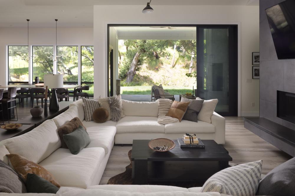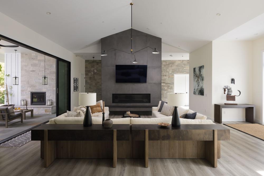 Designed by the owners as a destination retreat, the home draws the outdoors inward through extensive glass, natural materials, and a layout that keeps each space connected to the landscape. Stone sourced from Napa Valley and layered textures throughout reinforce a modern farmhouse aesthetic rooted in its environment.