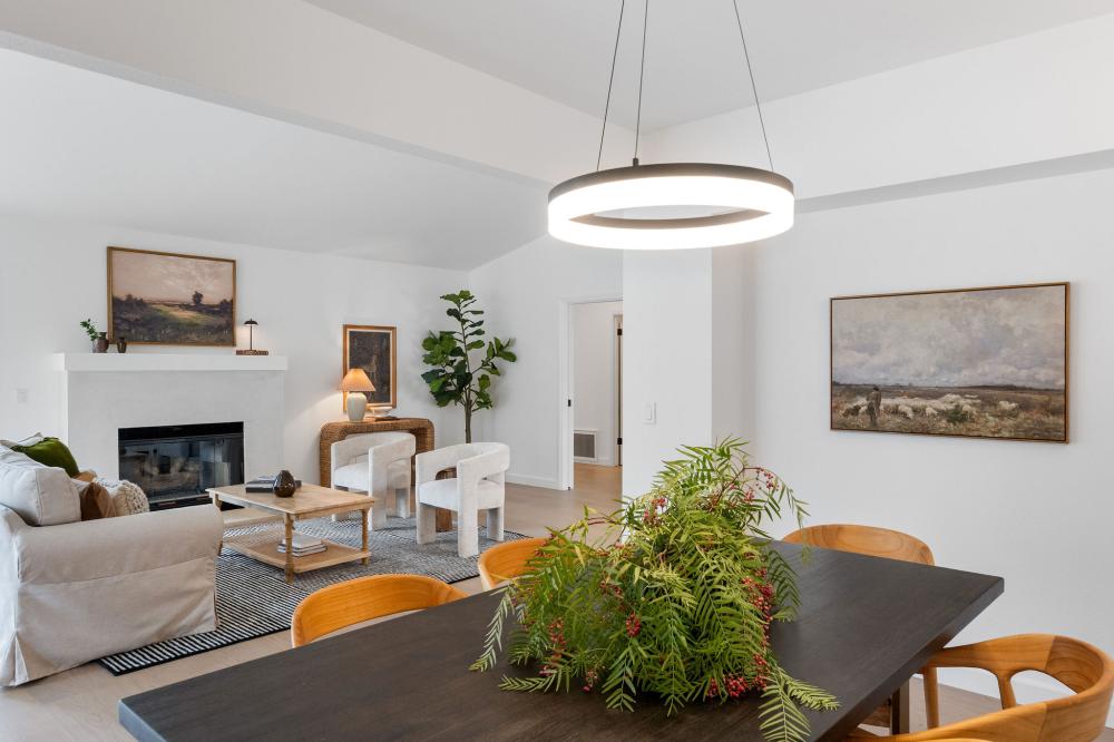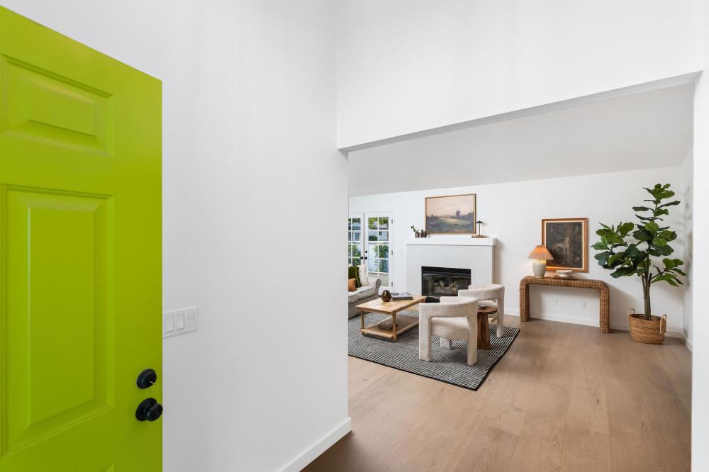 Inside, a 2023 renovation introduced elegant engineered oak flooring throughout, refreshed kitchen and baths, and a contemporary palette that highlights the home’s airy scale. Soaring ceilings and large windows amplify the sense of openness, while thoughtful design details bring ease to daily living.